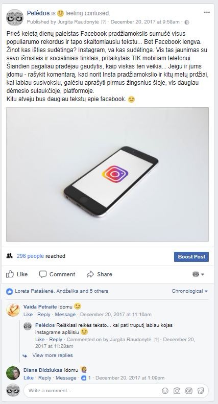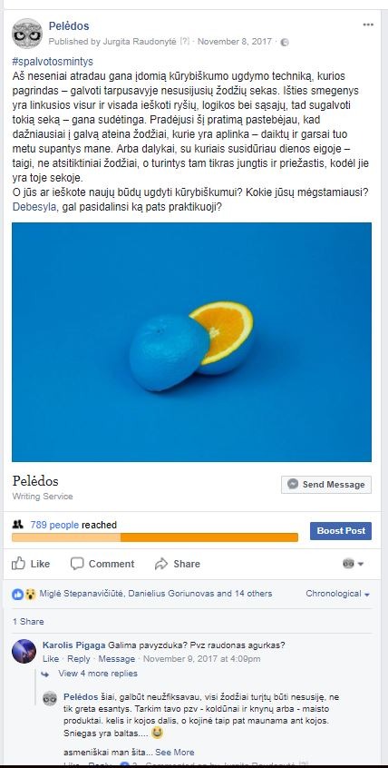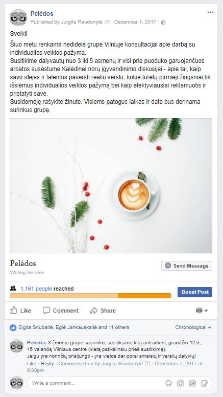 20th December 2017 Turinys "Pelėdos" Facebook Pelėdos - mano asmeninis Facebook puslapis, kuriame dalinuosi savo straipsniais, bendrauju su klientais, skelbiu apie teikiamas paslaugas. Auditorijos dydis - 600 sekėjų.