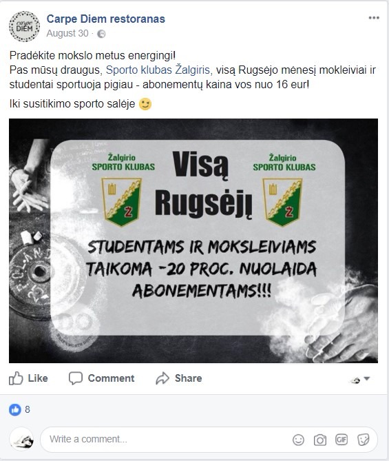 28th August 2017 Carpe Diem restorano Facebook Pranešimas rašytas Carpe Diem restorano užsakymu. Paskyra administruota 2017 m. birželio - rugsėjo mėnesiais. Sekėjų - 2 400.