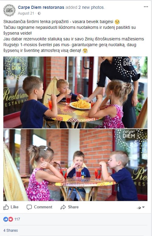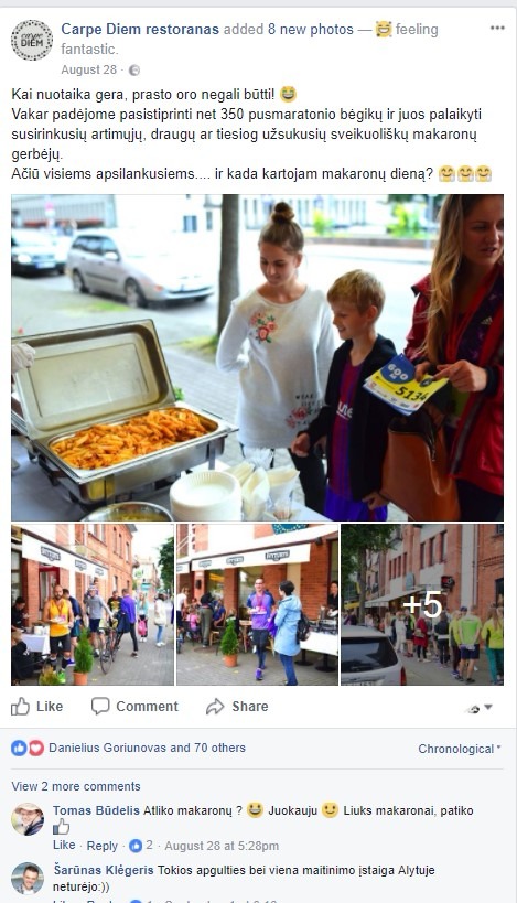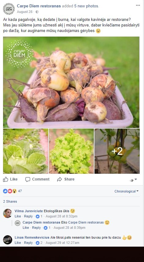 28th August 2017 Carpe Diem restoro Facebook Pranešimas rašytas Carpe Diem restorano užsakymu. Paskyra administruota 2017 m. birželio - rugpjūčio mėnesiais. Sekėjų - 2 400.