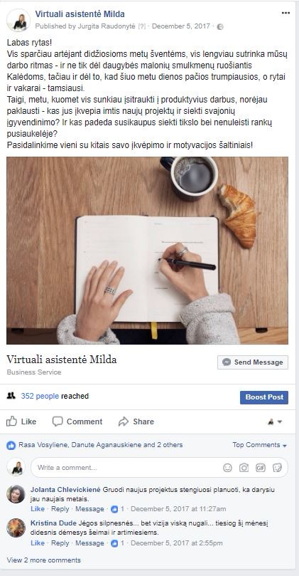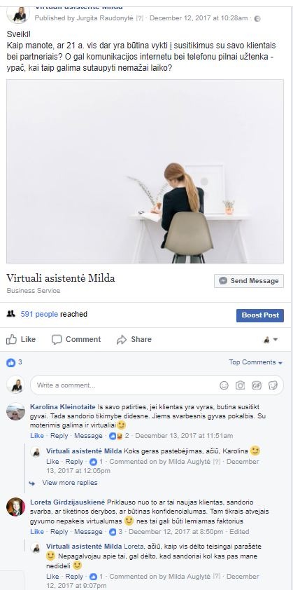 3rd January 2018 Žinutė "Virtuali Asistentė Milda" Facebook puslapiui Puslapiui turinys kuriamas nuo 2017 lapkričio mėnesio. Paskyra turi 750 sekėjų.