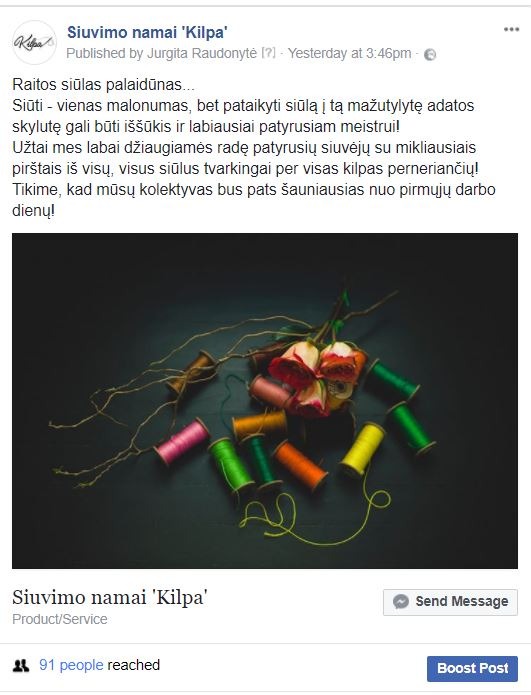 21st February 2018 Tekstas "Siuvimo namai Kilpa" Facebook puslapiui Naujas puslapis, pradėtas 2018 m. sausio mėnesį. Įmonė veiklą pradėti ketina 2018 m. kovą. Šiuo metu auditorijos dydis - 120 sekėjų.